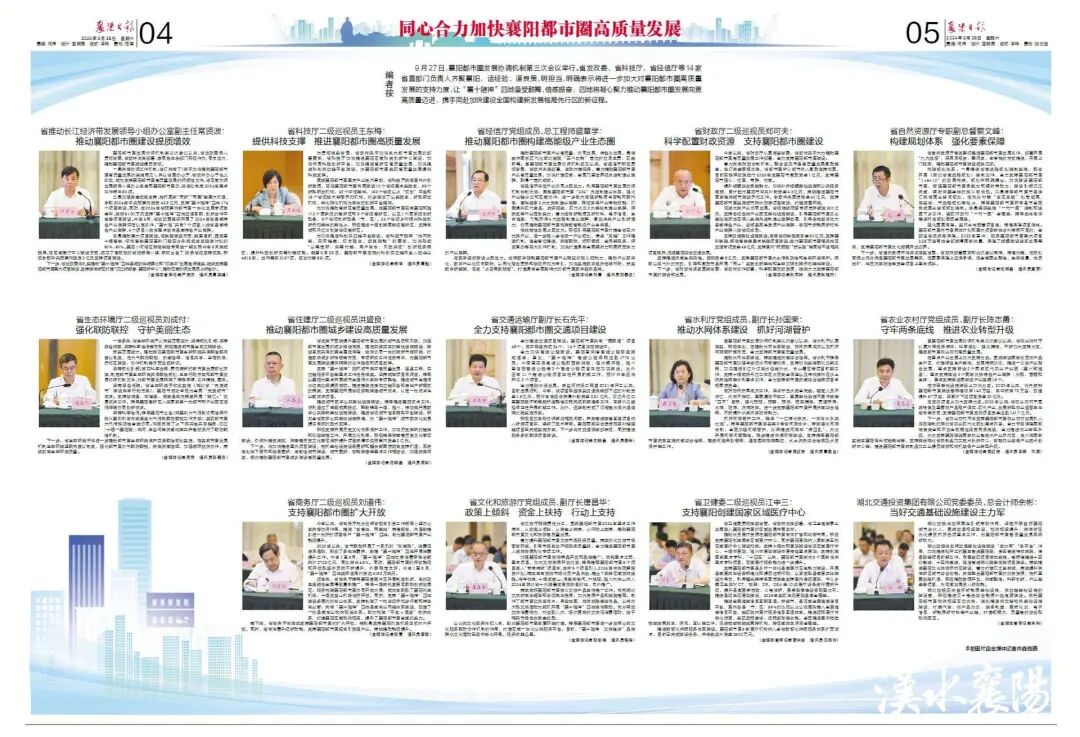 9月27日,襄阳都市圈发展协调机制第三次会议举行。省发改委、省科技厅、省经信厅等14家省直部门负责人齐聚襄阳,话经验、谋良策、明担当,明确表示将进一步加大对襄阳都市圈高质量发展的支持力度,让“襄十随神”四地备受鼓舞、倍感振奋,四地将凝心聚力推动襄阳都市圈发展向更高质量迈进,携手同赴加快建设全国构建新发展格局先行区的新征程。