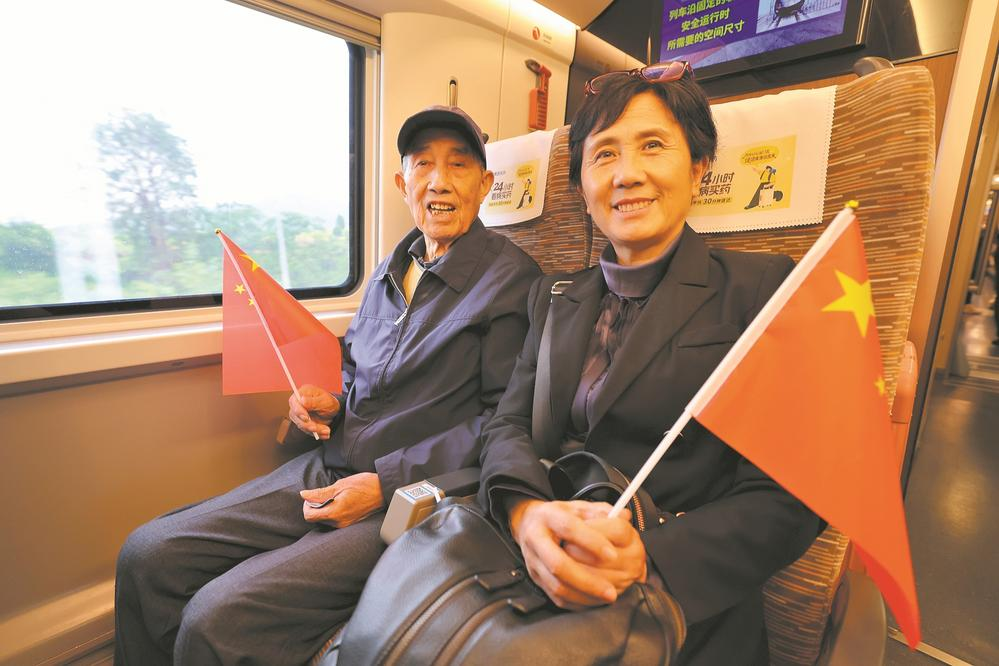 坐上飞驰的列车,老人心情激动,思绪万千。“我们原来修铁路、坐火车,那车是烧煤的,老火车‘咚咚’响,噪音大,煤烟味也重。”对比今昔,他脸上洋溢着幸福的笑容,“现在这个车,平稳又安静,也没有味道,空气也好,和家里一样,还有电视看!”
