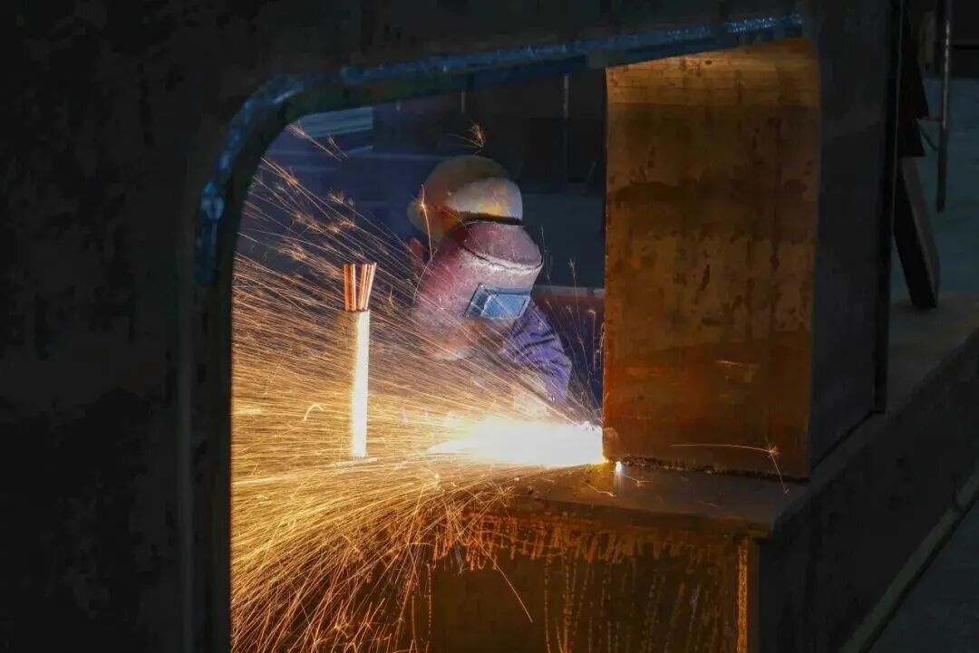 中铁十一局集团汉江重工有限公司生产车间内,员工正在进行电焊作业